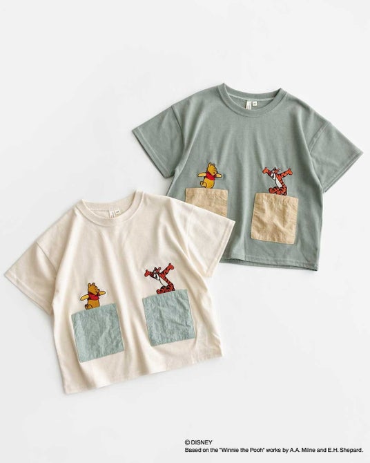 ポケットから飛び出した「プーさん」と「ティガー」が楽しい刺繍Tシャツ。配色にしたナイロン素材のポケットも映えるデザインです。リラックス感のあるサイジングもポイントです。