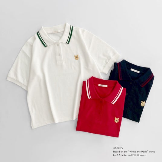 胸元に「プーさん」の刺繍が施されたポロシャツ。配色襟がポイントの一着です。
