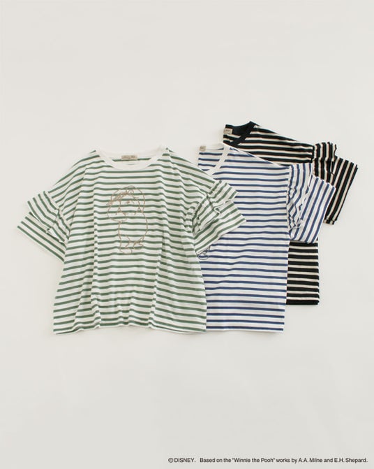 デイリー使いに定番のボーダーTシャツ。フロントに施された「くまのプーさん」の刺繍と肩のフリルが華やかな印象にしてくれます。