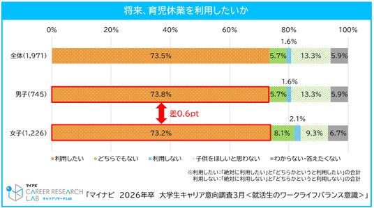 就職先で育児休業を利用したいと考える学生は性別に関係なく7割以上