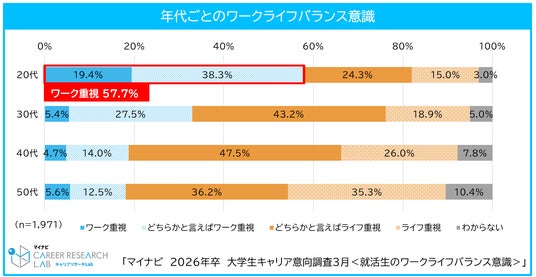57.7%の学生が“20代でのワークライフバランス”は「ワーク」を重視
