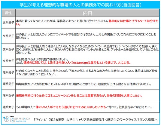 学生に職場の人との理想的な関わり方について自由回答で聞いたところ、多く寄せられたのは「仲の良い人とはプライベートでも遊びたい」といった意見だった。その一方で「基本的には仕事とプライベートは分けたい」という意見もあり、特に飲み会などのイベントについては強制参加には否定的な意見が多かったが、コミュニケーションの一環として自ら希望して参加するような関係性については肯定的だった。このように、「(同期や上司関係なく)仕事でしか関わりたくない」というよりも、「公私をしっかりと分けたい」という学生の価値観が多くみられた。【図3】