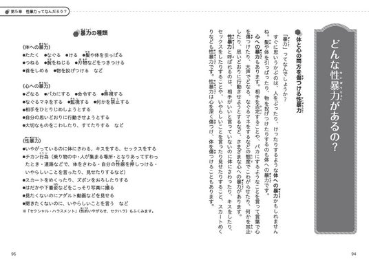 本書は大きく2つの内容で構成されており、前半は性教育、後半はよくある性被害の事例を通じて性被害に遭うリスクを軽減したり、性の問題行動を起こしたりしないような力をつけられるようになっています。