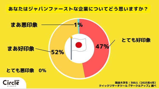 あなたはジャパンファーストな企業についてどう思いますか?という質問に対して、とても好印象と回答した人は47%、まあ好印象と回答した人は52%、まあ悪印象と回答した人は1%、とても悪印象と回答した人は0%でした。