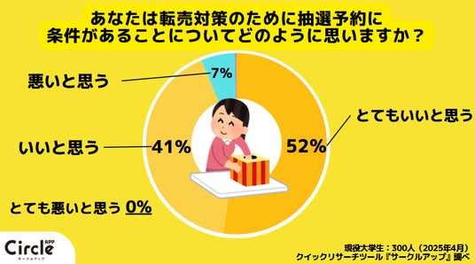 あなたは転売対策のために抽選予約に条件があることについてどのように思いますか?という質問に対し、とてもいいと思うと回答した人は52%、いいと思うと回答した人は41%、悪いと思うと回答した人は7%、とても悪いと思うと回答した人は0%でした。