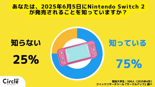 あなたは、2025年6月5日にNintendo Switch 2 が発売されることを知っていますか?という質問に対し知っていると回答した人は75%、知らないと回答した人は25%でした。