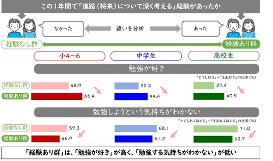– 「進路について深く考える」経験があった子ども(経験あり群)は、「勉強が好き」と答える比率が高く、「勉強しようという気持ちがわかない」の肯定率は低い。【図表1-1】