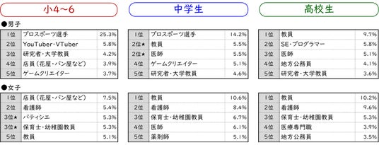 – なりたい職業No.1は、小4~6生では「プロスポーツ選手」、中学生では「プロスポーツ選手」と「教員」、高校生では「教員」だった。男女によって、なりたい職業には違いがある。また、男女でなりたい職業は異なり、小4~6の男子は「プロスポーツ選手」、女子は「店員(花屋・パン屋など)」が人気。【図表4-1、4-2】
