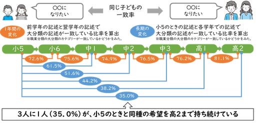 – なりたい職業の記述について個人の変化を分析したところ、3人に1人(35.0%)が小5のときと同種の希望を高2まで持ち続けている。【図表3-1】
