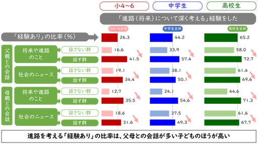 – 周囲の大人はどうかかわるか:子どもが進路を考えるためには、学校と家庭の支援が欠かせません。調査では、「尊敬できる先生がいる」といった教員との良好な関係や、「グループで考える」「討論する」「ふりかえる」といった探究的な授業のスタイルが、「進路を深く考える」経験と関連していました。また、家庭では、「将来や進路」「社会のニュース」といった話題を親子で話すことが、子どもが進路を考えるきっかけになっているようです。