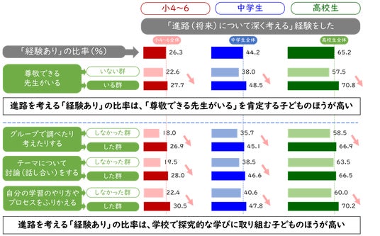 – 学校(教員)要因―「尊敬できる先生がいる」を肯定する子どもや、学校で探究的な学びに取り組んでいる子どもは、「進路について深く考える」経験をしている比率が高い。【図表2-1】