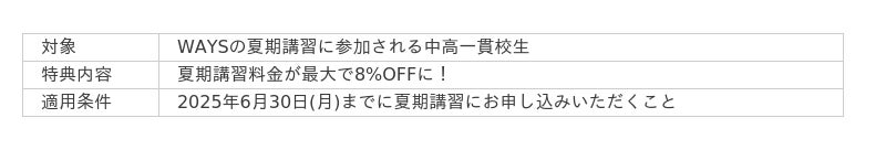 株式会社メイツ(本社:東京都新宿区 代表取締役:遠藤尚範)が運営する『中高一貫校専門 個別指導塾WAYS(以下、WAYS)』では、2025年6月30日(月)までに当塾WAYSの夏期講習にお申し込みいただいた方を対象に、夏期講習の料金が最大8%OFFとなる「夏休み応援キャンペーン」を実施いたします。なお当塾の夏期講習は7月19日(土)より開講です。大変お得なキャンペーンとなっておりますので、ぜひこの機会にお申し込みください。