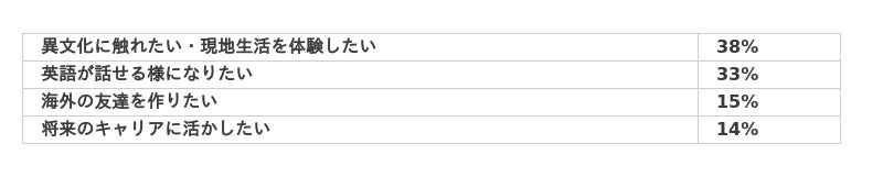一方で、「将来のキャリアに活かしたい(14%)」「海外の友達を作りたい(15%)」といった動機は相対的に低く、就職・人脈形成といった長期的視点よりも、“今この瞬間の体験”や“自己成長”に重きを置いている傾向が読み取れます。