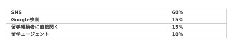 SNS(60%)が他の情報源を大きく引き離して圧倒的な主役となっている点は、Z世代の情報収集行動の根本的な変化を象徴しています。もはや留学の検討は、「エージェントに相談に行く」や「公式サイトで調べる」といった従来型のトップダウン的な情報取得ではなく、SNSで“自分と似た誰か”の体験を吸収する共感型スタイルへと完全に移行しています。