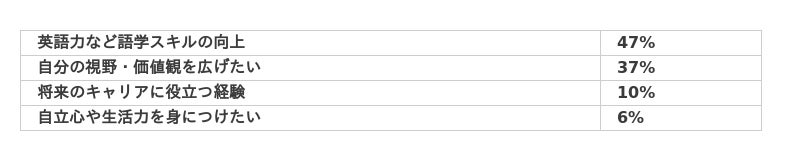 一方、「将来のキャリアに役立つ経験」(10%)や「自立心や生活力の習得」(6%)といった項目は比較的低く、実利性や精神的成長よりも、まずは語学+価値観の変化という“今の自己”にフォーカスした動機が強いことがわかります。