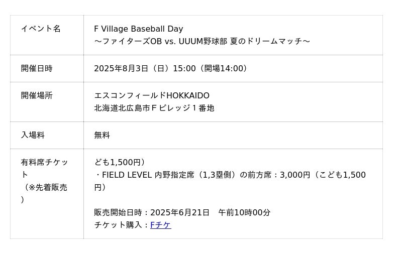 UUUM株式会社(本社:東京都港区、代表取締役社長:梅景 匡之、以下「UUUM」)は、北海道日本ハムファイターズOB選抜とUUUM所属の野球好きクリエイターが参加する「UUUM野球部」が対戦するプレミアムマッチ「F Village Baseball Day ~ファイターズOB選抜 vs. UUUM野球部 夏のドリームマッチ~」を2025年8月3日(日)、エスコンフィールドHOKKAIDO(北海道北広島市)で開催します。