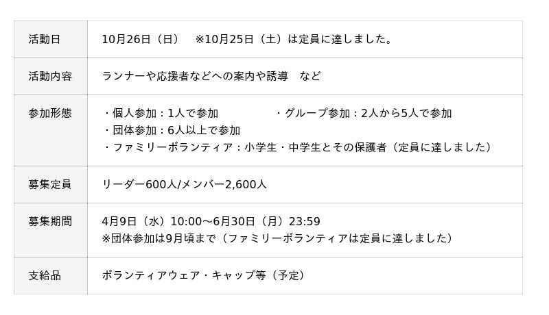 フルマラソン化から10周年という節目の年となる今大会では、小・中学生のお子様とその保護者の方が参加できるファミリーボランティアを新設。また、横浜駅・新横浜駅への便利な送迎(関内駅等一部集合場所は定員により締切)、普段車やバイク以外では入ることができない首都高速道路での活動ができることなどもポイントです。好評により、早くも定員に達しているカテゴリーもあります。