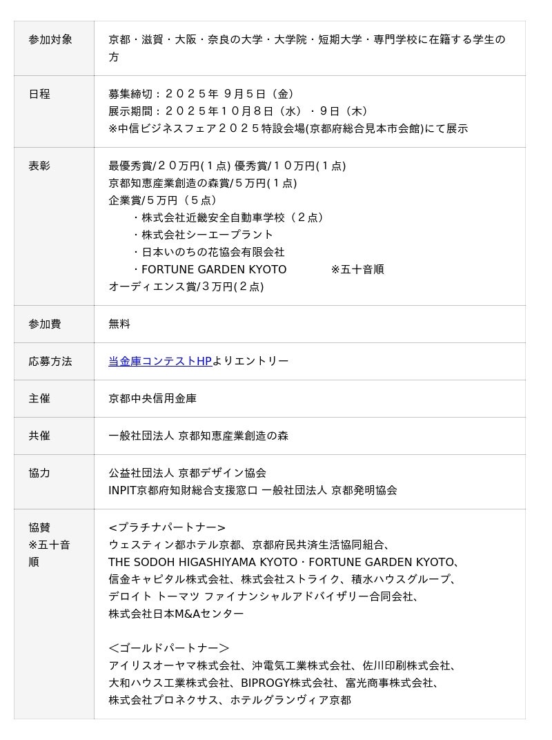 京都スタートアップ・エコシステム推進協議会の構成団体である京都中央信用金庫は、2025年10月8日(水)・9日(木)の「中信学生デザインコンテスト2025」の開催にあたり、応募作品を募集します。