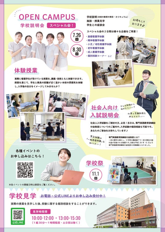 本校では4月より月に1回の頻度でオープンキャンパスを行っています。7月26日(土)・8月30日(土)はスペシャル会を開催予定。授業見学や看護体験、学校見学ツアー、学生との座談会など、学生が主体となって考案した企画を楽しみながら、入学後の学生生活をイメージしていただけます。また、個別相談コーナーのブースも設けており、入学やカリキュラム、就職についてなど、気になることを直接ご相談いただくことも可能です。