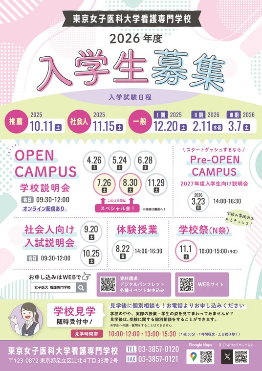東京女子医科大学看護専門学校(校長:塩沢俊一)では、毎月1回のオープンキャンパスを実施中です。(開催日:6月28日(土)・7月26日(土)・8月30日(土)・11月29日(土))。
