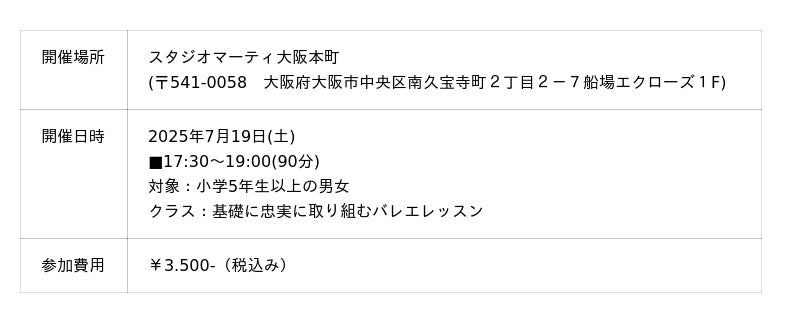 なお講師の中尾太亮さんは「バレエアンサンブルガラ2025・大阪公演」へも出演が決定しているダンサーです。