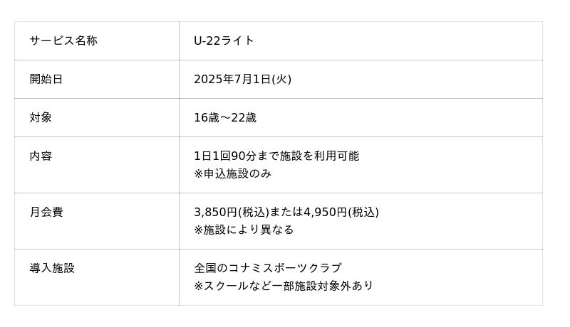 コナミスポーツ株式会社(以下、「弊社」)が運営するコナミスポーツクラブは16歳から22歳までの限定プラン「U-22ライト(アンダーニジュウニライト)」を7月1日から開始します。1日1回90分、お得な価格で施設を利用できるサービスです。