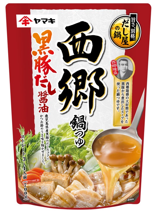 西郷隆盛は黒豚を使った料理が大好物であったと言われています。本品は、鹿児島県産黒豚のガラから煮出したスープに、鹿児島県製造のかつお節を加えることでだしをしっかり効かせ、九州製造醤油で仕上げた、豊かなコクとうま味を楽しんでいただける鍋つゆです。