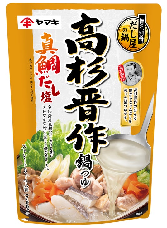 幕末の長州藩士、高杉晋作は鯛が好物であったと言われています。本品は、晋作が好んだとされる鯛の塩煮をイメージした鍋つゆで、宇和海産真鯛からとった上品なだしのうま味に柚子のさわやかな香りを効かせ、あっさりながらも満足感のある塩味に仕上げています。