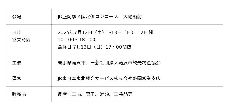 JR東日本東北総合サービス株式会社(本社:宮城県仙台市、代表取締役社長:弭間 俊則、以下「LiViT」)は、地域活性化の取り組みの一環として、岩手県滝沢市と連携し「たきざわ鈴の音フェア」を開催します。滝沢市自慢の農産加工品・菓子・工芸品などの販売を通じ「滝沢市の魅力」を発信します。ぜひこの機会に盛岡駅にお越しください。