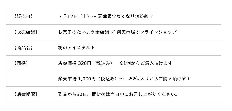 株式会社太陽社(所在地:千葉県匝瑳市飯倉293、代表取締役:片岡正裕)が展開する千葉県で長年愛される菓子店「お菓子のたいよう」は、2025年夏の新商品「アイスタルト」を7月12日(土)に発売いたします。冷凍状態でも驚くほどサクサクなタルト生地に、ふわとろのバニラムースと生クリーム、さらに旬の桃とグロゼイユを贅沢にトッピングした、ケーキのような本格派タルトアイスです。