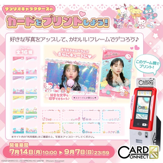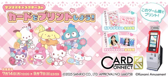 株式会社コナミアミューズメントは、アミューズメント施設向けカードプリントゲーム機『カードコネクト』にて、株式会社サンリオのキャラクターたちとのコラボデザインイベントを7月14日(月)から9月7日(日)まで開催することをお知らせします。
