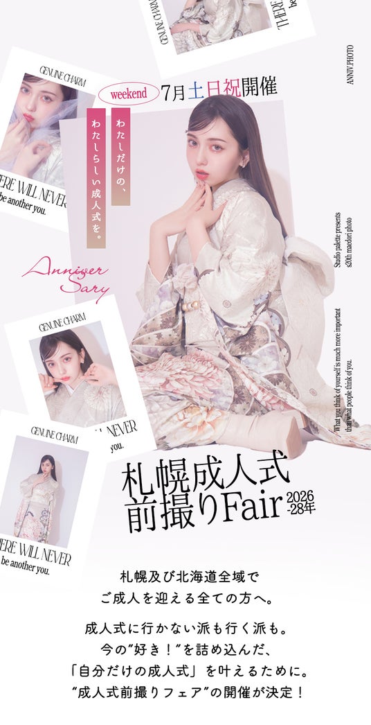札幌にある写真工房ぱれっと札幌中央店(本社/有限会社三景スタジオ)から、成人前撮りをご検討中の方へ向け、透明感溢れる夢幻的な空間の最新ビジュアルを公開いたしました。