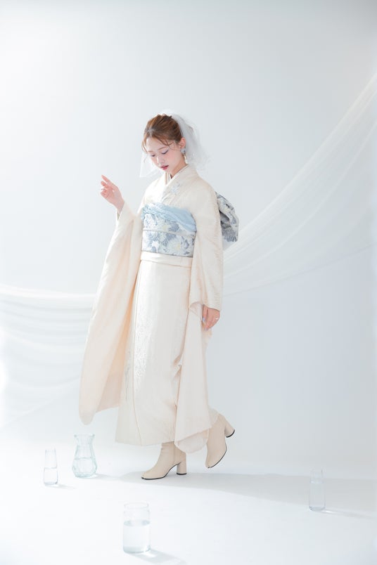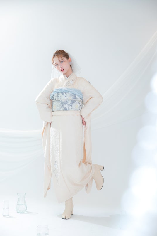 また、足元にはホワイトのショートブーツを合わせることで、伝統的な和装にモダンでスタイリッシュな要素を加えており、単なる和装ではない、新しいファッションとしての提案になっています。
