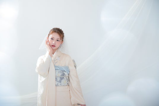 白やオフホワイトのシンプルな背景は、すっきりと洗練された印象を与え、被写体である着物やモデルに焦点を当てることができます。