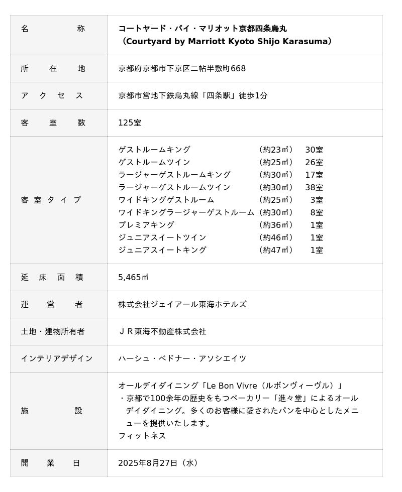 株式会社ジェイアール東海ホテルズ(本社:名古屋市 代表取締役社長 伊藤 彰彦)は、マリオット・インターナショナル(本社:米国メリーランド州 代表取締役兼CEO アンソニー・カプアーノ)とフランチャイズ契約し、「コートヤード・バイ・マリオット京都四条烏丸」を2025年8月27日(水)に開業いたします。