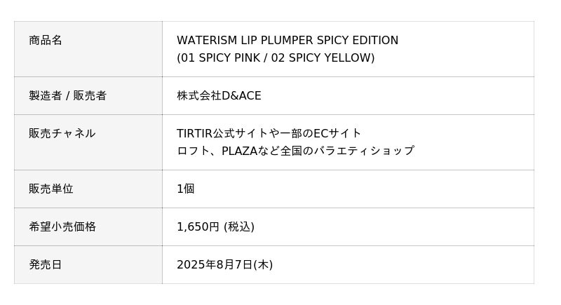 日清食品株式会社 (社長:安藤 徳隆) と株式会社D&ACE (社長:李 智哲) は、両社で共同開発した「WATERISM LIP PLUMPER SPICY EDITION 01 SPICY PINK」「WATERISM LIP PLUMPER SPICY EDITION 02 SPICY YELLOW」を8月7日(木)にコスメブランド「TIRTIR」公式サイトや一部のECサイト、全国のバラエティショップ*1で新発売します。