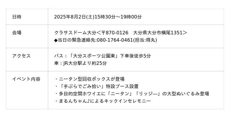 一般社団法人うみらいふは、8月2日(土)明治安田J2リーグ第24節FC今治戦にて、「CHANGE FOR THE BLUE DAY」を開催いたします。当イベントでは、大分トリニータのマスコットキャラクター「ニータン」の形をしたペットボトル回収ボックスが登場し「手ぶらでごみ拾い」特設ブースを設置。当日来場していただいた方々にごみ拾いの体験を提供いたします。袋・軍手・トング等の必要備品はすべて無償提供となっております。また、公式マスコットまるんちゃん♪によるキックインセレモニーも実施いたします。このイベントは、日本財団が推進する海洋ごみ対策プロジェクト「海と日本プロジェクト・CHANGE FOR THE BLUE」の一環で開催するもので、本取り組みを通じ大分の綺麗な海を未来に引き継ぐことを目的としています。また本取り組みは、ニータンと一緒に大分の綺麗な海をずっと守りたいという願いを込めて実施する「NEETAN FOR THE BLUE」の展開の一つです。
