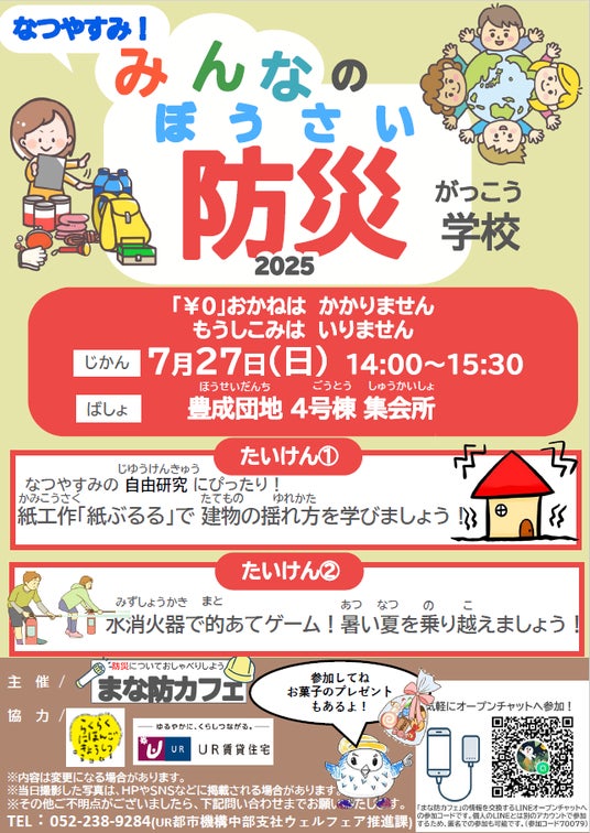 【概要】団地及び地域の子どもを対象に、紙模型の防災キットの作成や水消火器を使用したストラックアウトを実施予定。夏休みの自由研究ネタにも!