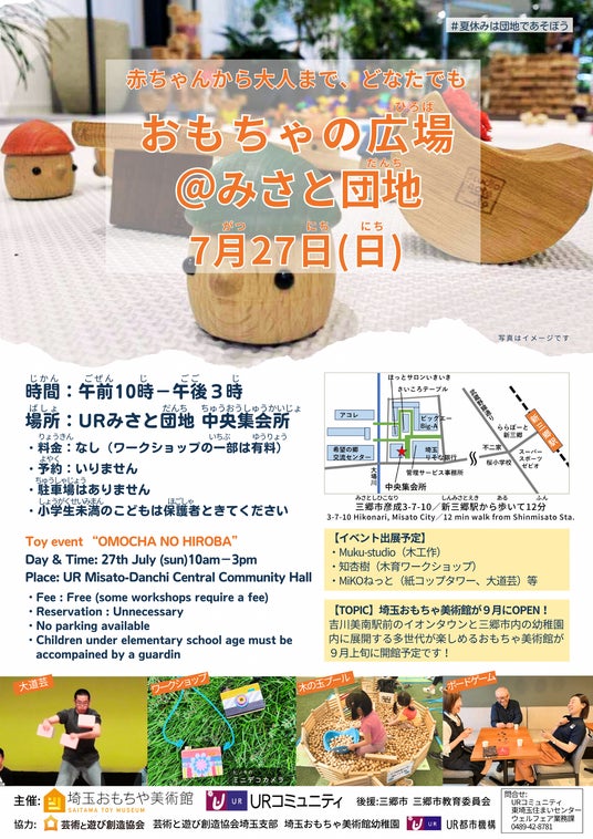 【概要】9月にみさと団地の一画に「埼玉おもちゃ美術館」がオープンします。これに先立ち、おもちゃ美術館や県内のおもちゃ作家、美術学校等と連携して、赤ちゃんから大人まで楽しめる遊びの場を開催します。