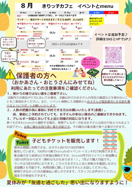 【概要】今年の夏はkiricafeに来て夏休みを友達と過ごしませんか?夏休み中毎日チューペット配布!遊び場、お昼ご飯、学び場を提供します。