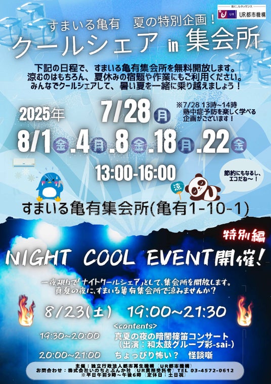 【概要】夏休みの一定期間、クールシェアスポットとして、集会所を開放します! 最終日は、子どもも大人も楽しめる、一夜限りのナイトクールイベントを開催!