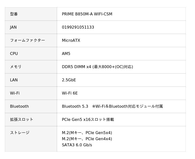 『PRIME B850M-A WIFI-CSM』は、AMD B850チップセット搭載 MicroATXマザーボードです。