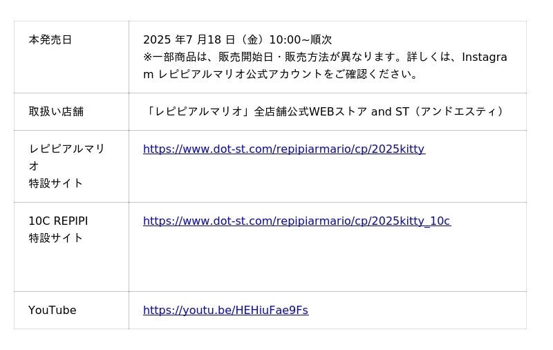 株式会社アダストリア(本部:東京都渋谷区渋谷2-21-1、代表取締役社⾧:木村 治)が展開するrepipi armario(レピピアルマリオ)と10C REPIPI(ジューシーレピピ)は、株式会社サンリオのハローキティとのコラボレーションアイテム全22 型を2025 年7 月18 日(金)より全国のレピピアルマリオの店舗・公式WEBストア and ST(アンドエスティ)にて発売いたします。