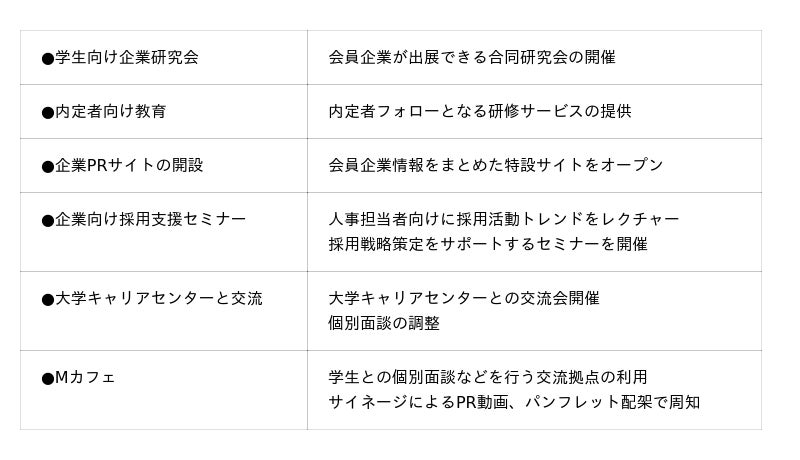 ●地元企業に、月額税別5万円の定額制(年払い)で、合同企業研究会や交流スペース「Mカフェ」など、採用に必要な多様なコンテンツを提供