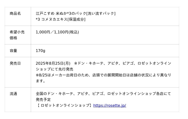 ロゼット株式会社(本社:東京都品川区、代表取締役社長:藤井 敬二)は、米ぬか美容でつるつる輝く江戸美人肌へ導くスキンケアブランド『江戸こすめ』の「江戸こすめ 米ぬか*3のパック」をリニューアルし、2025年8月25日(月)よりドン・キホーテ、アピタ、ピアゴ各店にて先行発売いたします。