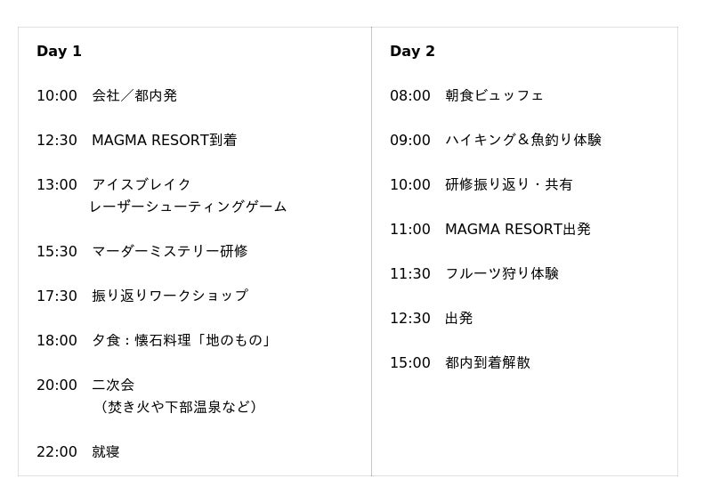 本プランは、山梨県南部・下部温泉に位置するリゾートホテル「MAGMA RESORT Shimobe」で、チームの連携力やコミュニケーション力の向上を目的とした法人向けの1泊2日研修プログラムです。