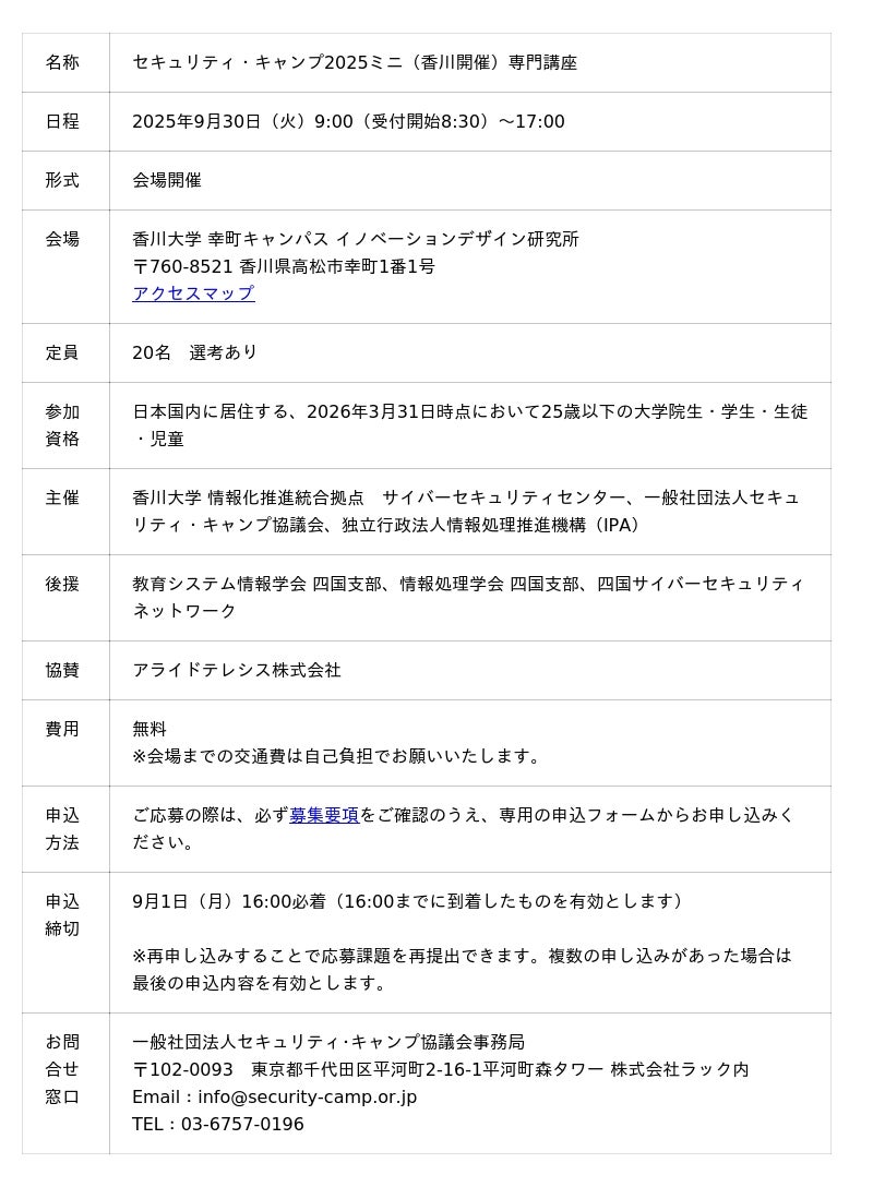 イベント詳細:https://www.security-camp.or.jp/minicamp/kagawa2025.html
