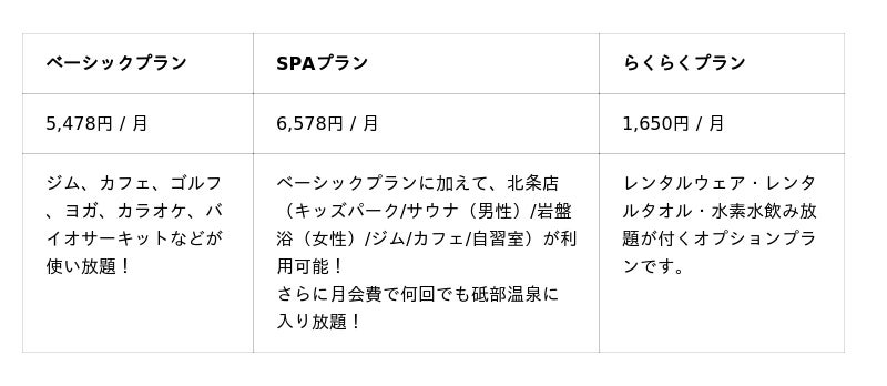 ※らくらくプラン:月額1,650円で、レンタルウェア・レンタルタオル・水素水飲み放題が付くオプションプランです。
