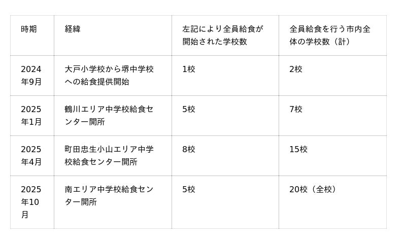町田市では、市立中学校に通う生徒全員に温かい給食を提供することを目的に、市内に3か所の給食センターを整備することで、市立中学校全校での全員給食実施に向けた取り組みを進めてきました。