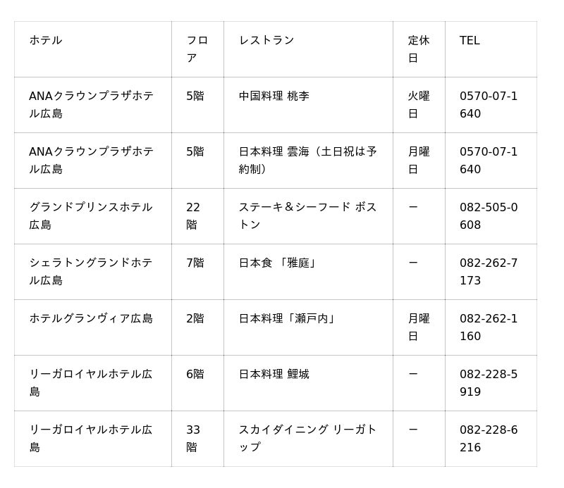 【参加レストラン】広島市内5ホテル7レストラン